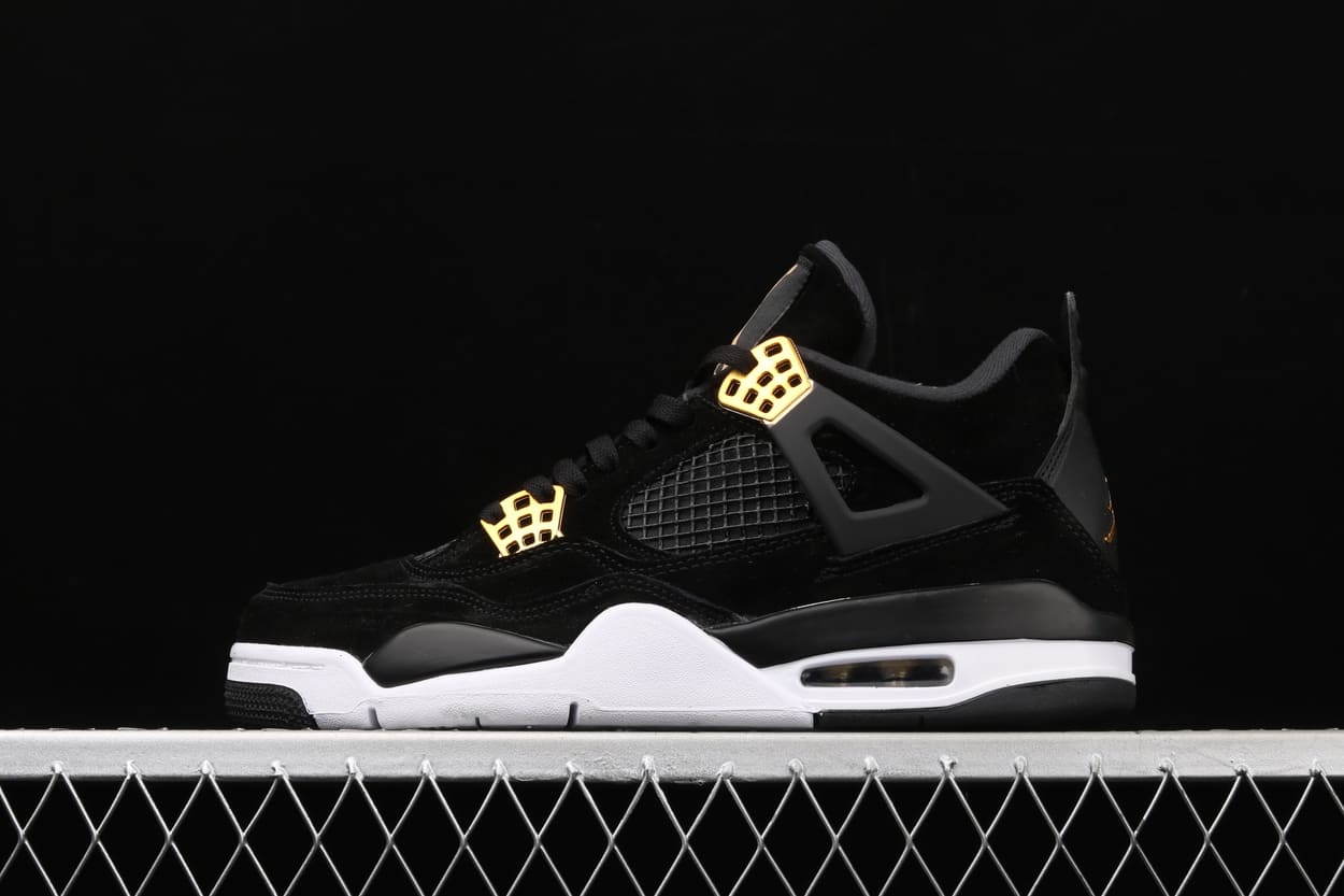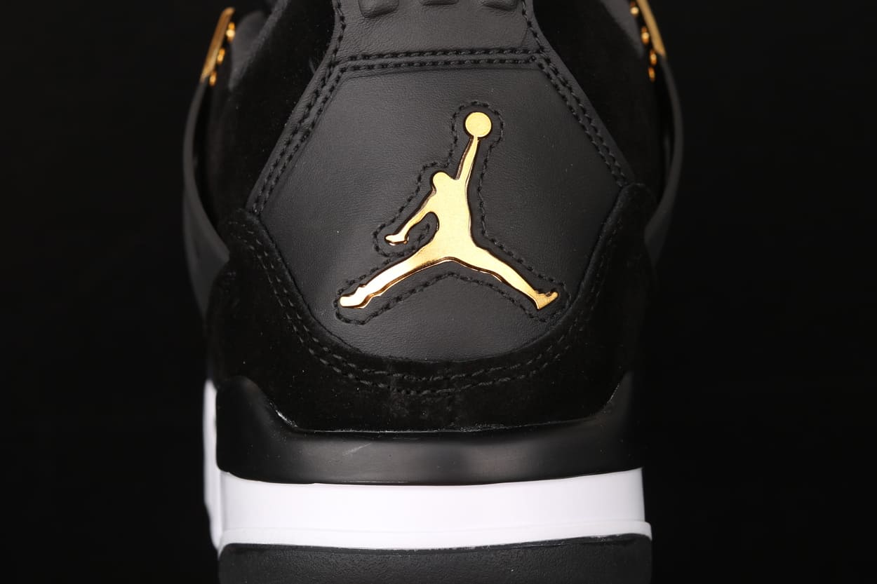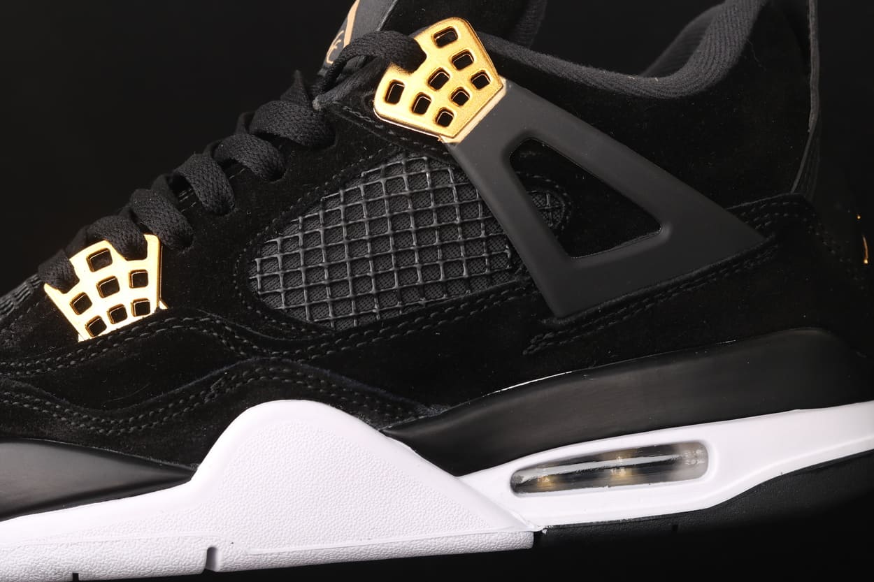 The Air Jordan 4 Retro Royalty has a combination of metallic gold accents on top of a monochrome black suede upper.