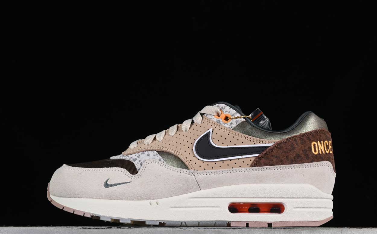 The University of Oregon PE (2024) iteration of the Nike Air Max 1’87 sports an upper of iridescent textiles in brown at the toebox and green at the collar. Perforated tan leather overlays adorn the quarter panel, while white and gray leopard print accents the eyestays. Beige suede forms the mudguard and mottled brown suede the heel counter. The blue side panel Nike Swoosh is echoed by a miniature Swoosh embroidered on the lateral toecap. The off-white Phylon midsole houses visible Air and rests atop a tan and off-white rubber outsole.