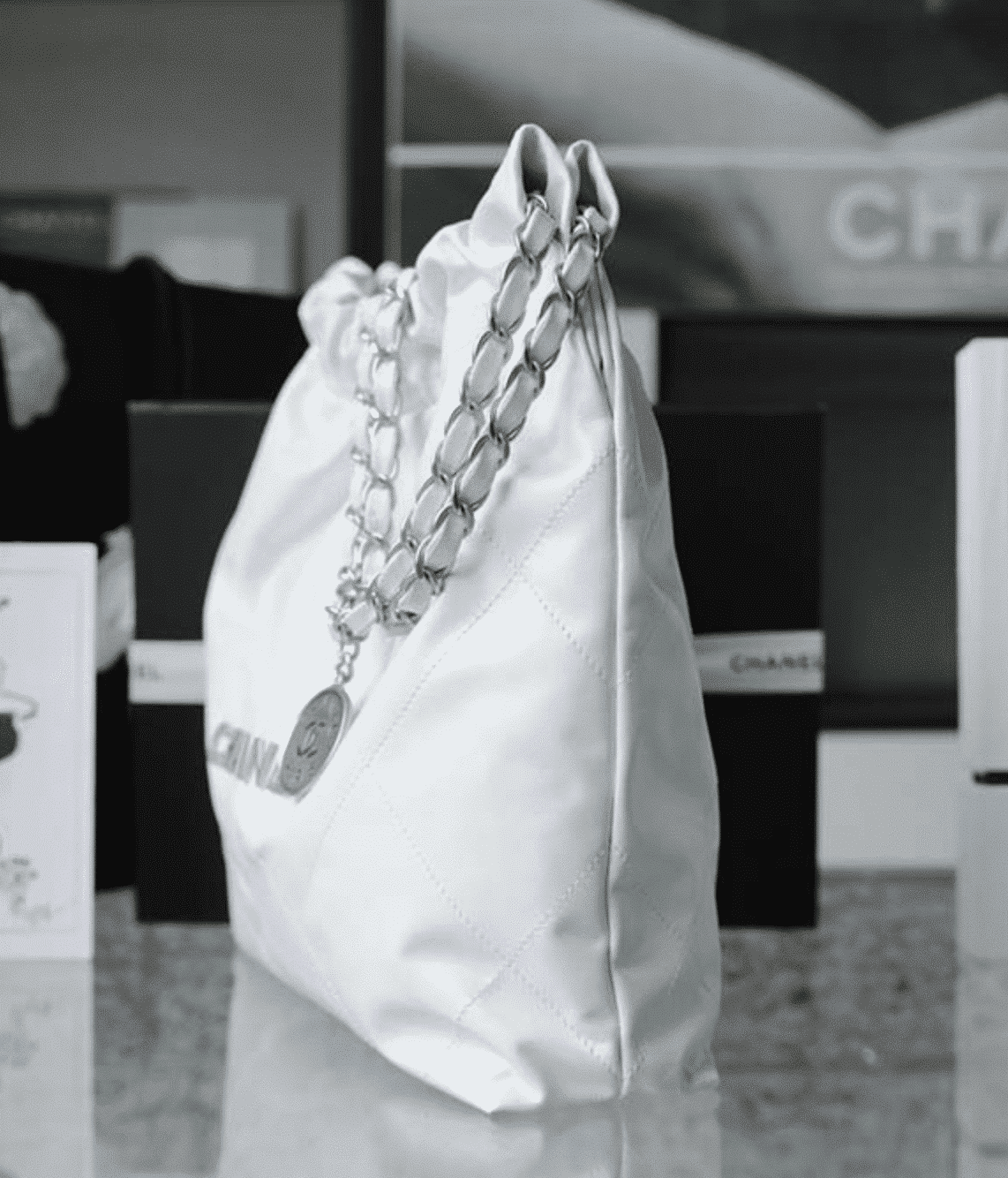 CHANEL 22 HANDBAG WHITE SILVER 42CM AS3261
