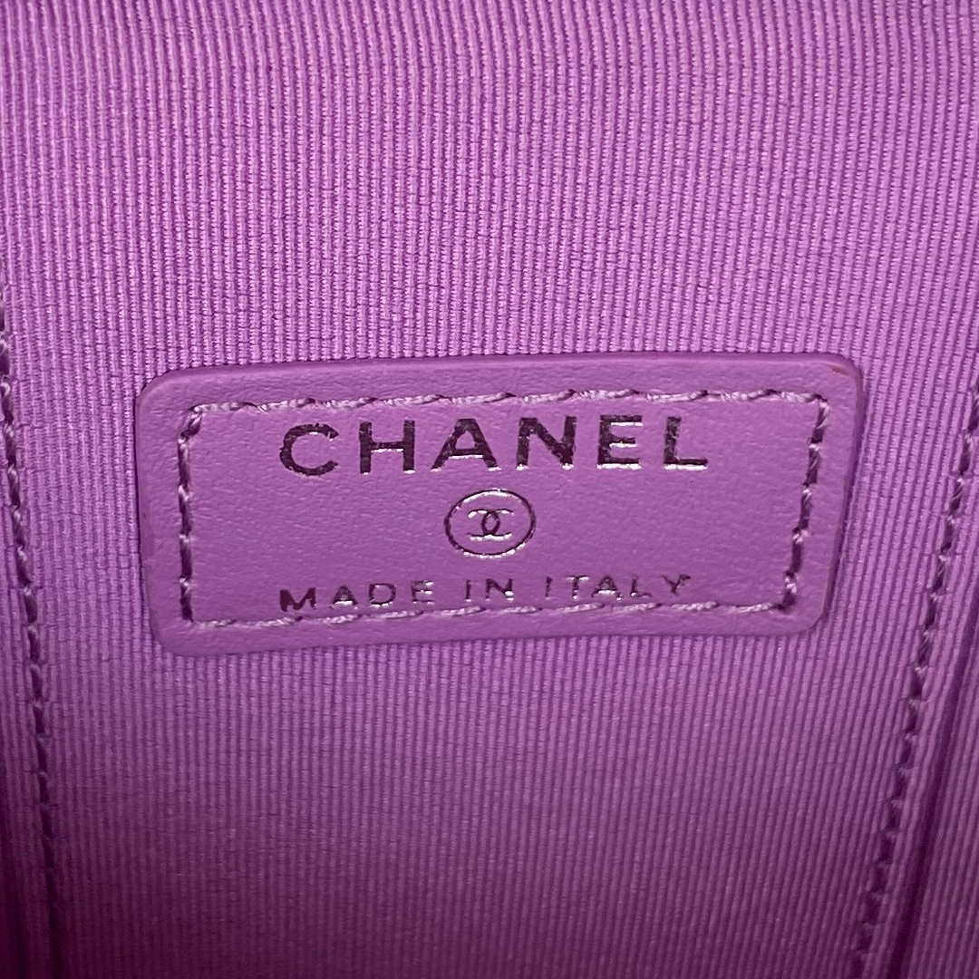 Clutches with Chain of the Spring-Summer 2023 collection: Small Vanity with Chain, lambskin & gold-tone metal, Purple on the CN official website