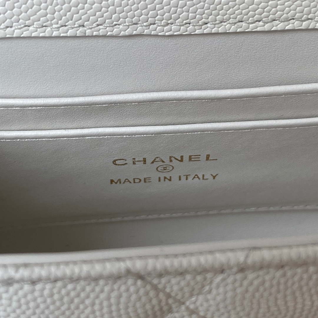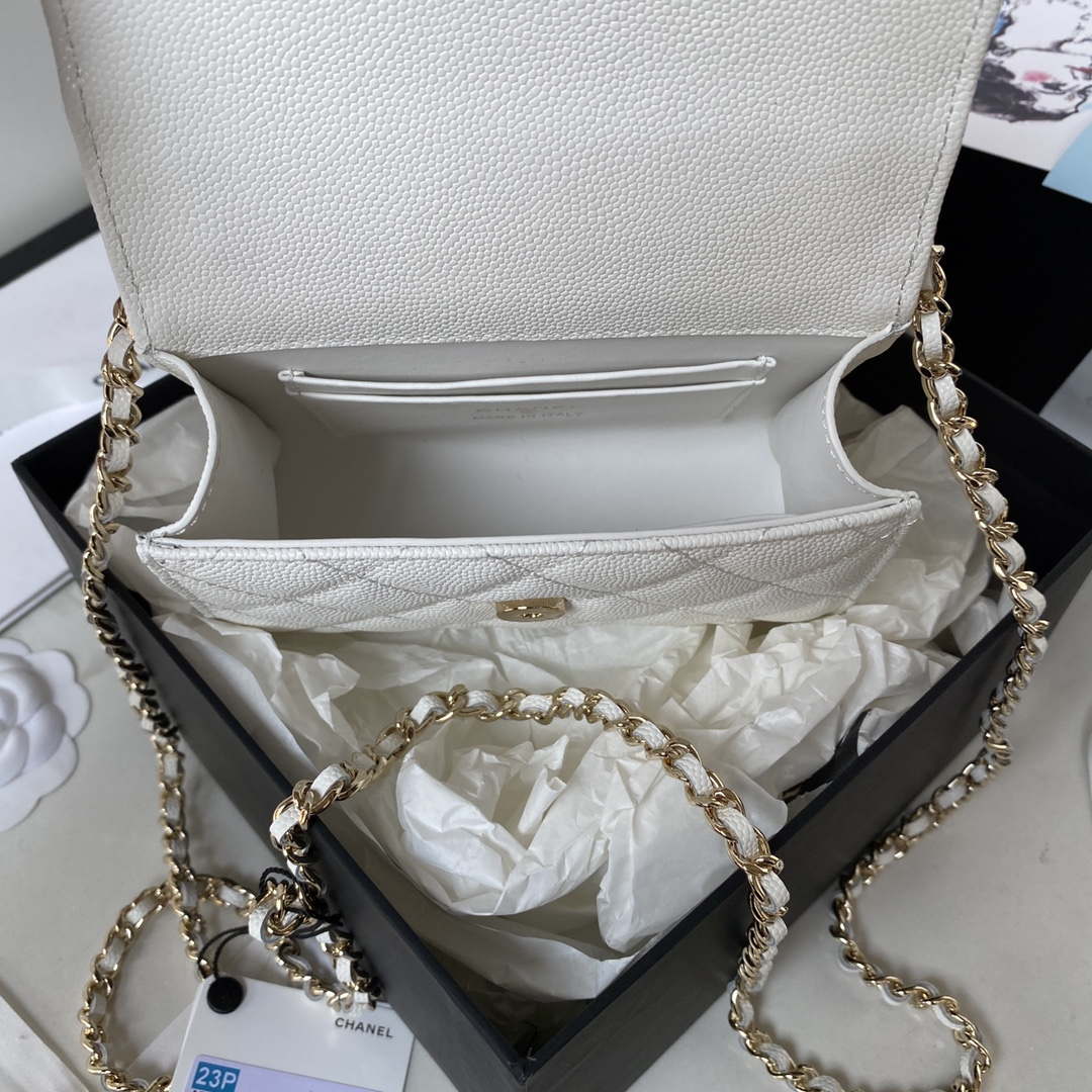 Clutches With Chain of the Spring-Summer 2023 Pre-collection collection: Clutch With Chain, grained shiny calfskin & gold-tone metal, white on the CN official website