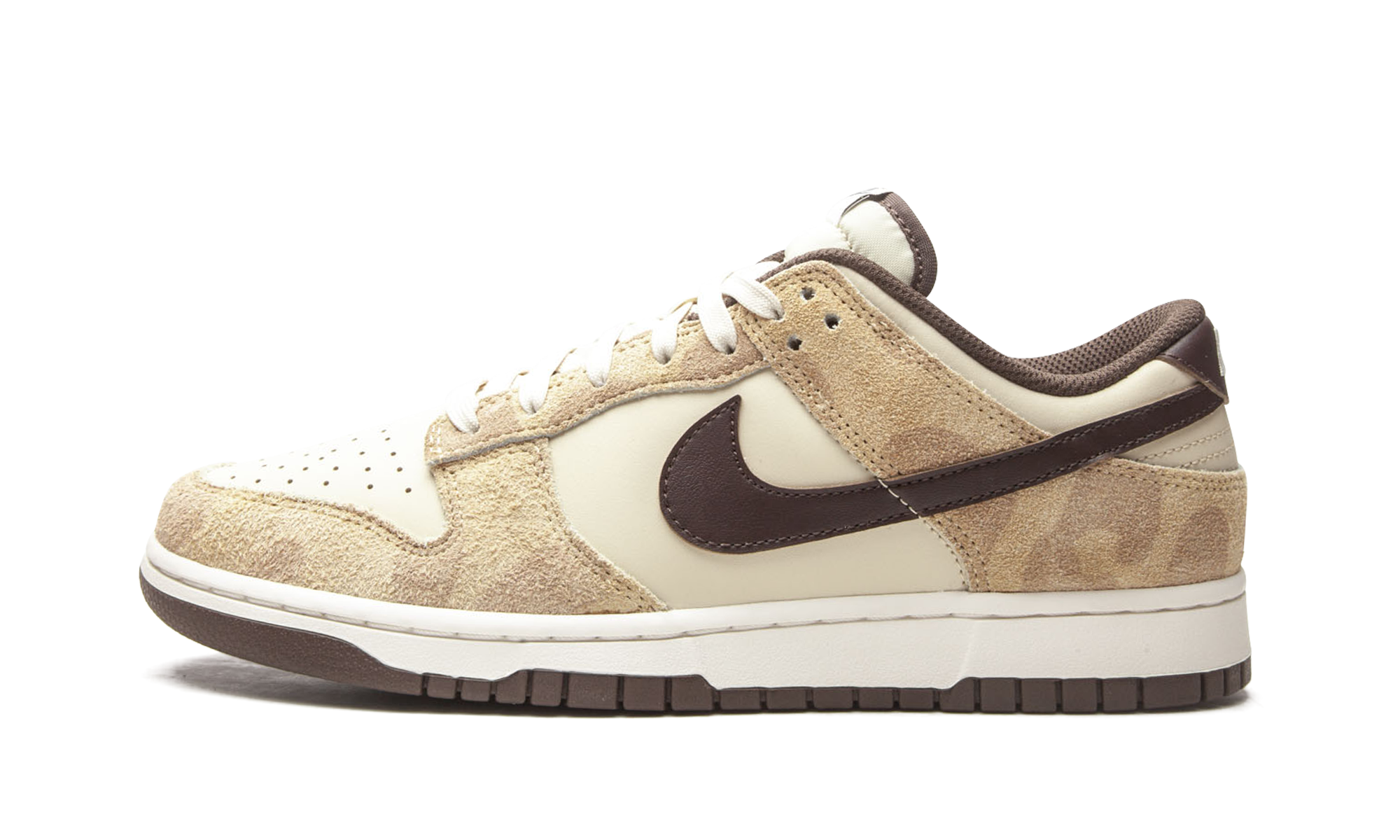 The Nike Dunk Low PRM “Cheetah” is one of two safari-themed releases of the low-top shoe by Nike in Spring 2021. From Nike’s “Animal Pack” that also includes a “Zebra” colorway, the “Cheetah” brings a premium look to the beloved former basketball and current lifestyle shoe by employing a color block reminiscent of the colors found on the fast feline. Nike dresses the Dunk’s base in cream leather and applies subtle spots to the light brown suede overlays found on the forefoot, eyelets, collar, and heel. A slightly glossy dark brown leather Swoosh appears on both sides and “Nike” detailing is embroidered onto the heel. Brown “Nike” branding is located on white tongue tag found on the top of the cream-colored nylon tongue. Cream laces and a brown inner lining continue the neutral based look of the shoe. Nike supplies the “Cheetah” Dunk with a white rubber midsole and brown outsole. Release date: June 22, 2021