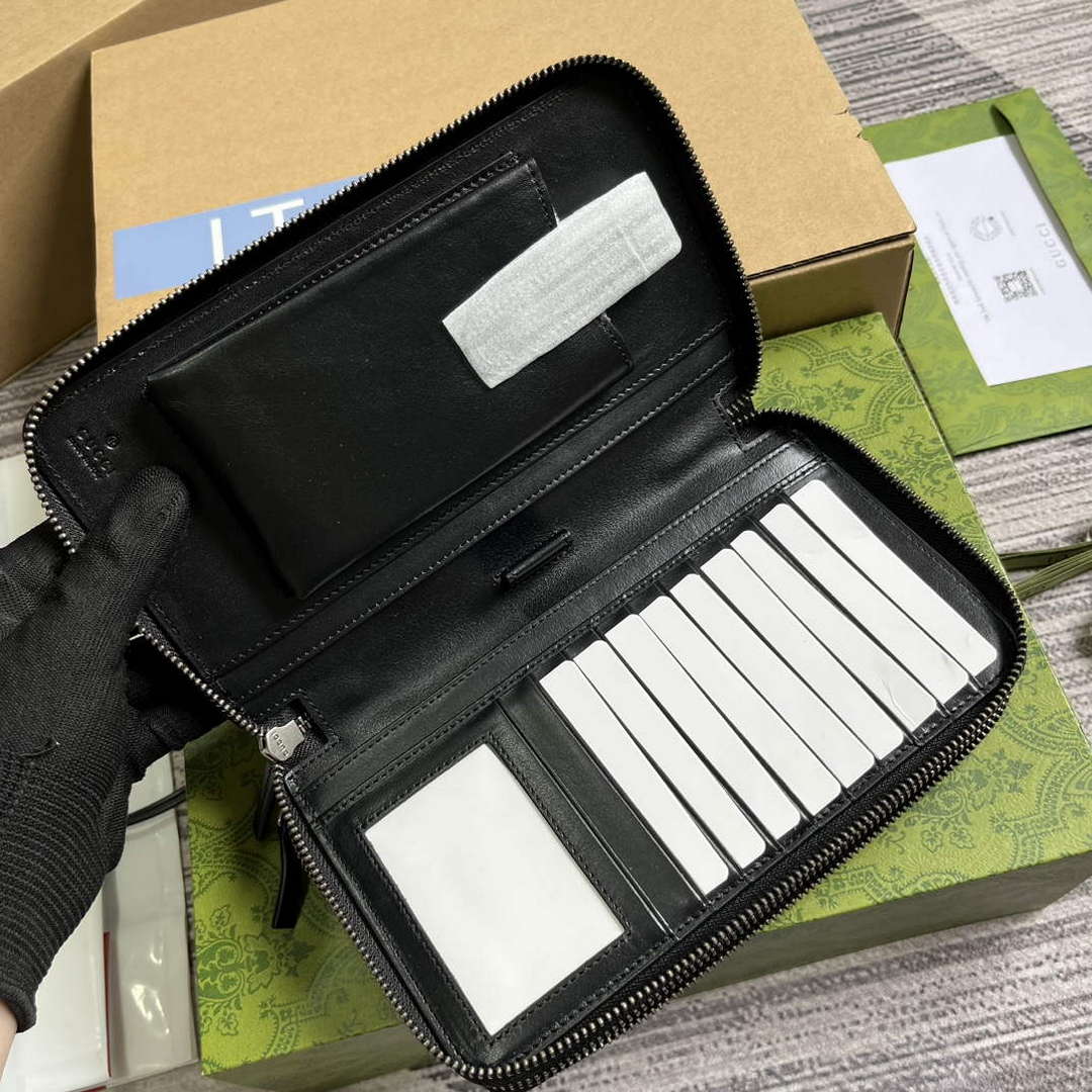The all-black jumbo GG design returns for Pre-Fall 2023 atop a selection of small leather pieces. A reinterpretation of GGo GG’s initials, the motif is an evergreen of the House that appears prominently in maxi size for an eye-catching logo feel. Here the emblematic leather defines this travel document case secure with a zip closure.