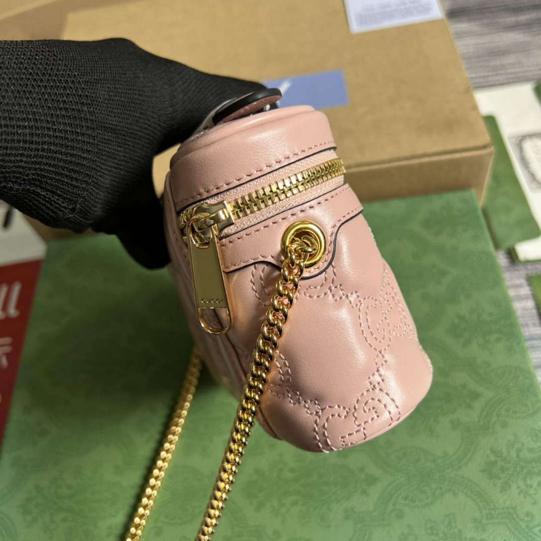 Matelassé leather is a signature material of the House, thanks to its super soft finish. The textured geometric motif defines a selection of small leather accessories, including this light pink mini bag. The Double G hardware decorates the front, continuing the logo feel of the design.