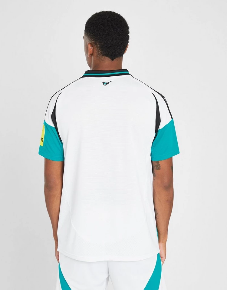 Show your team pride in this men’s Newcastle United FC 2024/25 Third Shirt by adidas. In a White and EQT Green colourway, this slim-fit shirt is made with smooth, durable recycled polyester for lasting comfort. It’s crafted with sweat-wicking AEROREADY technology, and has airy mesh inserts to keep you cool. It features a classic polo collar with a button placket, and short sleeves for a game-ready look. Finished with adidas’ iconic 3-Stripes at the shoulders and a Performance logo to the chest, with a Newcastle United FC badge to sign off. Machine washable. | IW0390