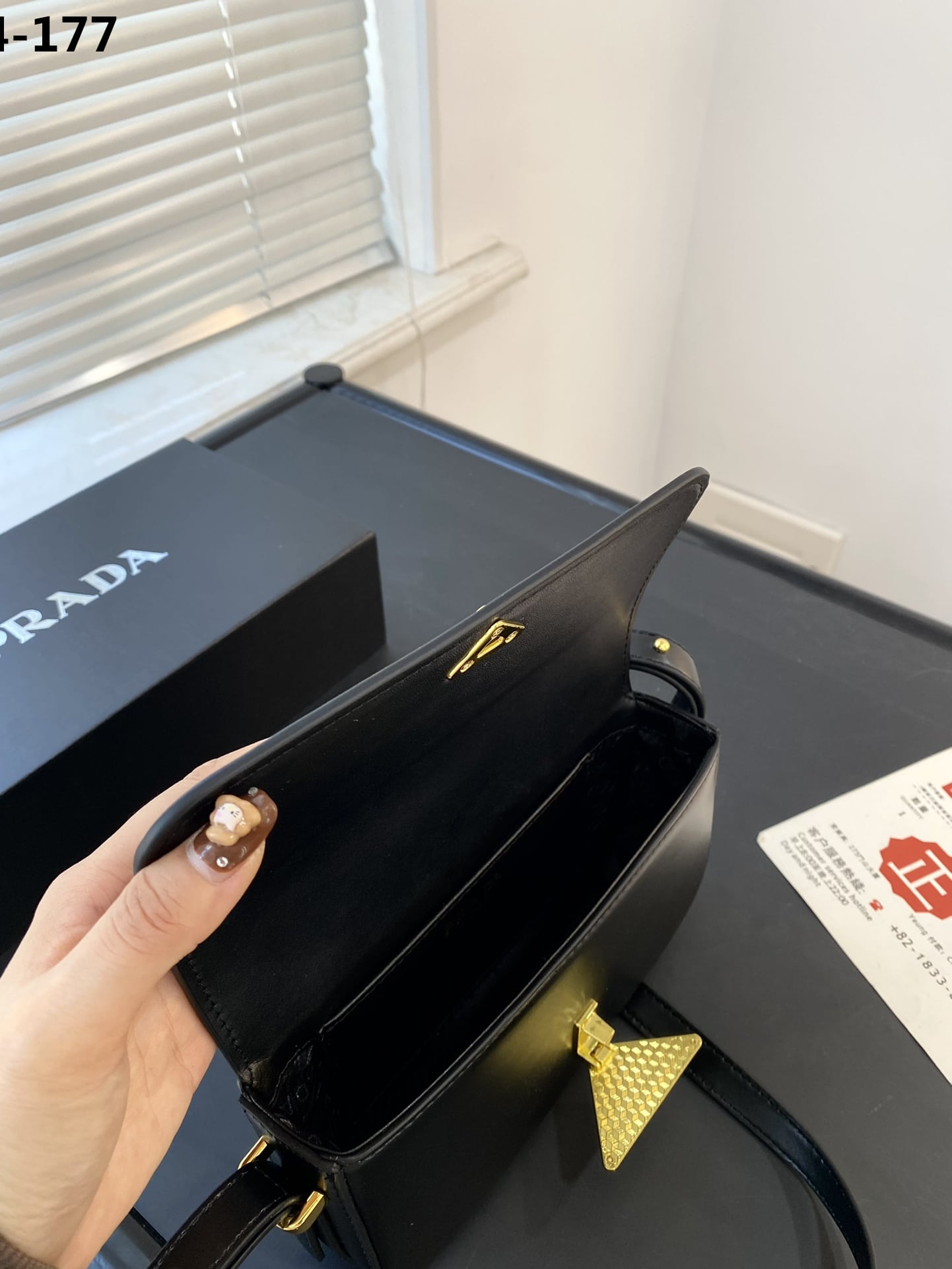 - Logo engraved on the enameled metal triangle clasp on the flap