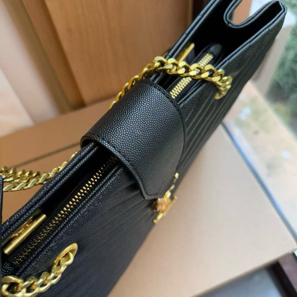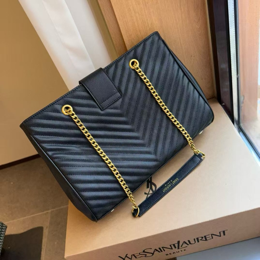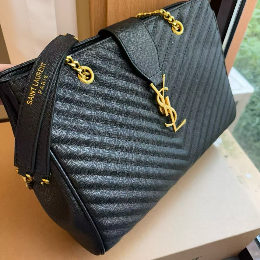 This Saint Laurent Shopping Bag is crafted from black grain de poudre leather with elegant matelassé chevron quilting and signature YSL monogram in gold hardware. The spacious 35cm silhouette offers everyday practicality while delivering timeless luxury and refined Parisian style.